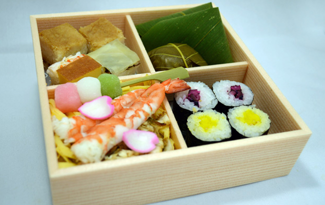 | 可愛らしい半人前の折に五分巻四種類(鉄火と胡瓜、お新香、柴漬け)と、一口サイズのちらしを組み合わせましたトッピングも彩りよく、プチ贅沢な味覚をお楽しみください。 |