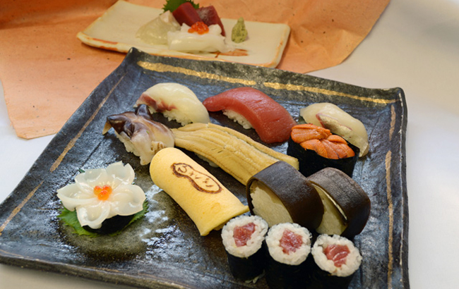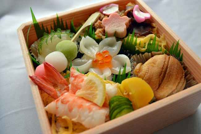 | 鯵の小袖(求肥昆布巻)・鮪・穴子・縞鯵・雲丹・そして鳥貝が入ります。鉄火五分巻・ミニの造り・ちらしを錦糸玉子のワッフル型でふんわりと包みました。桜の細工寿し・吸物又は赤出汁・水物付き。 |