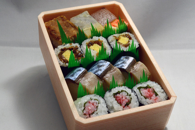 鯛、ケラ、鱧の箱寿しと、玉子椎茸巻3巻、ミニ鯖寿司3缶、梅じそ巻3巻の詰合せ。